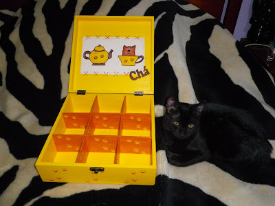Caixa de Chá " 4 Gatos ", em madeira, com 9 divisões, pintada à mão e gatos pintados em tecido - 29,90 nininhos